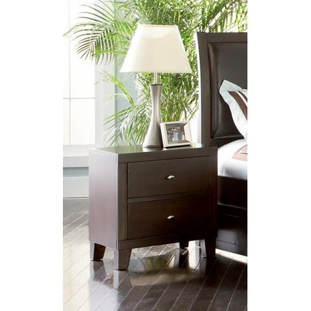 Complement your bed with the contemporary styling of this two drawer night stand Block feet in a modern taper shape form a sturdy yet stylish base while two storage drawers offer ample space for placing books and everyday items neatly out of sight The bedside table s smooth rectangular surface is ideal for placing lamps or frames and highlights the rich depth of the dark brown finish that wraps the entire piece Brushed nickel finish hardware crowns each drawer with a chic contemporary finish